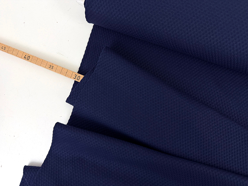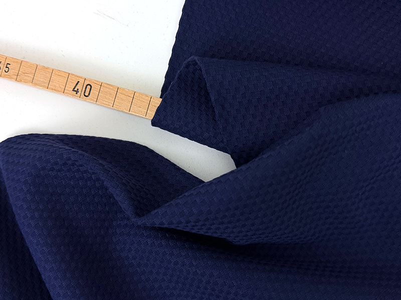 Ein Baumwollstrickjersey mit einem dezenten, eingestrickten (Ton in Ton) Schachbrett Muster. Der Stoff besitzt in etwa Jerseystärke mit etwas mehr Gewicht (210gr/qm), so dass er sich perfekt für Shirts, Longlseeves oder auch leichte Cardigans eignet ohne auszuleiern. Der Farbton ist ein klassisches Dunkelblau.