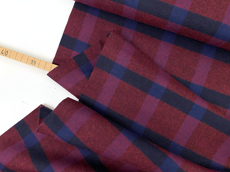 Der Stoff ist ein schön kuscheliger Baumwollflanell mit einem modernen Karomuster in Bordeauxrot, Beere mit Navy.