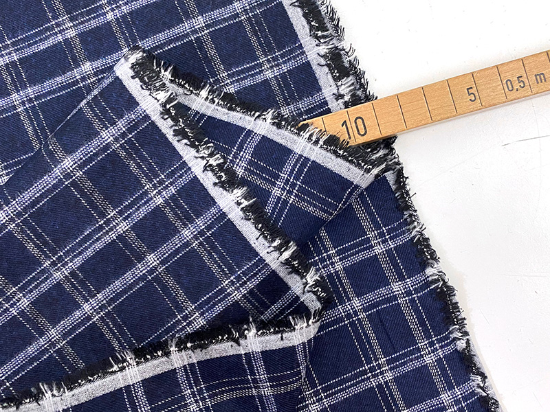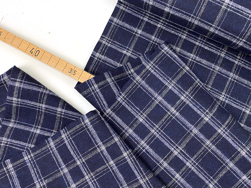 Der Stoff ist ein schön kuscheliger Baumwollflanell mit einem klassischen, dezenten Karomuster in Navy und Weiß.