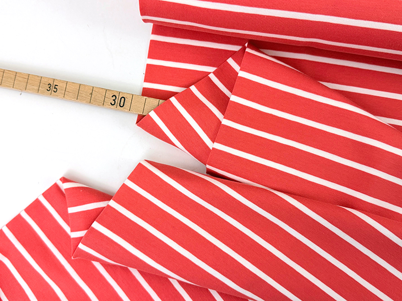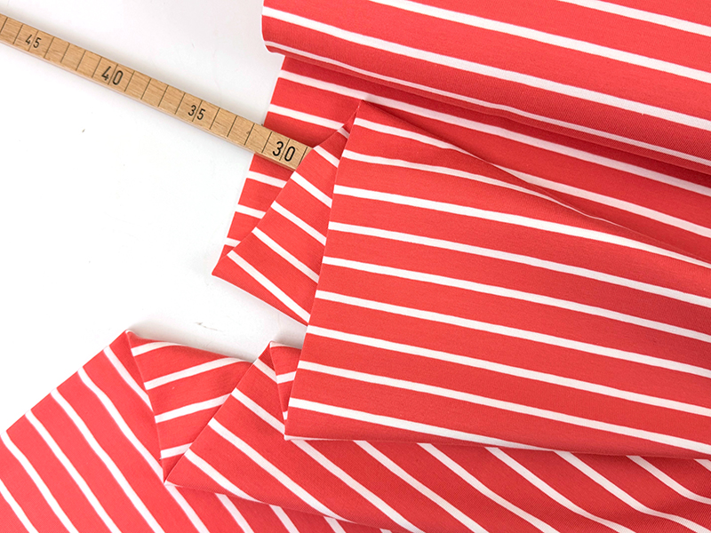 Baumwolljersey in intensivem Koralle mit Weiß gestreift. Ein Klassiker, der immer geht! Besonders schick aufgrund der unterschiedlich breiten Streifen im bretonischen Stil. Wunderschöne, frische und frühlingshafteFarbkombination.