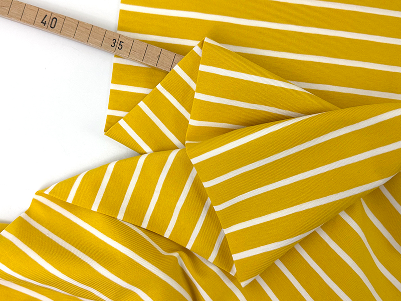 Baumwolljersey in warmem Gelb mit Weiß gestreift. Ein Klassiker, der immer geht! Besonders schick aufgrund der unterschiedlich breiten Streifen im bretonischen Stil. Wunderschöne, frische und frühlingshafteFarbkombination.