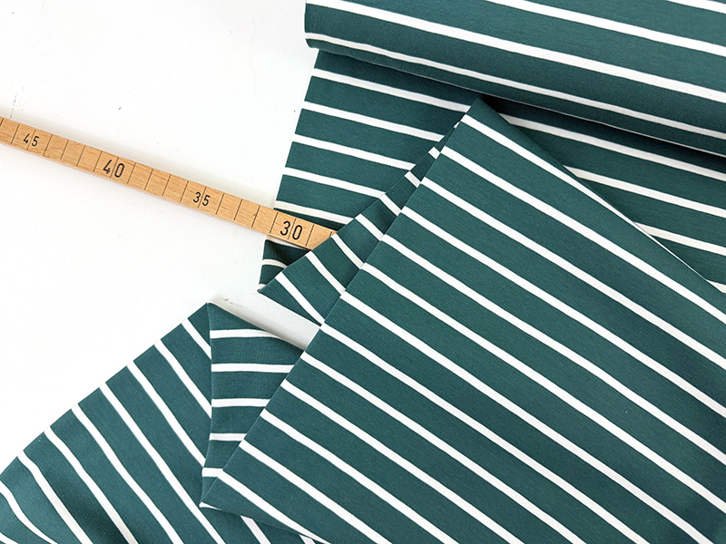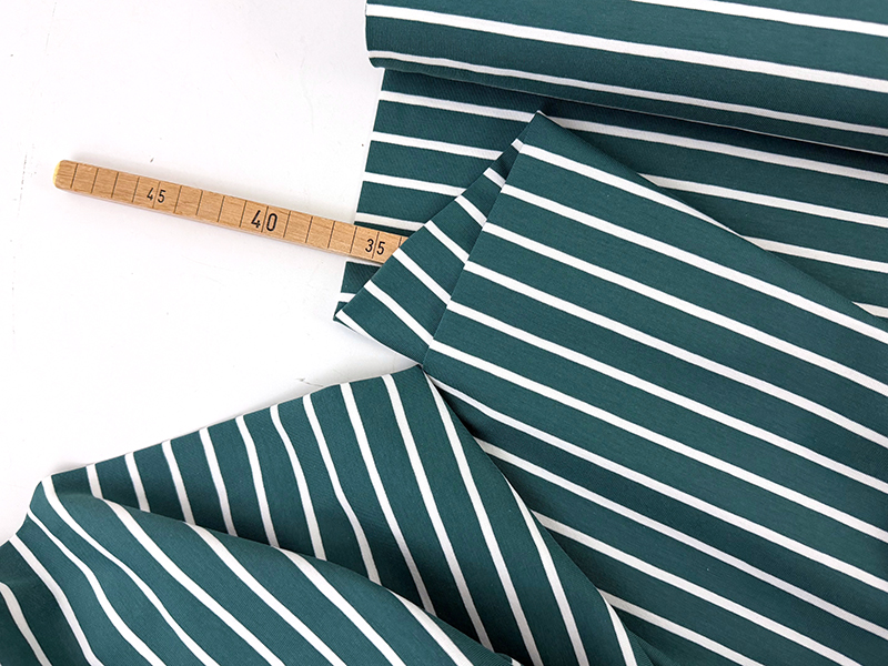 Baumwolljersey in gedecktem Aqua mit Weiß gestreift. Ein Klassiker, der immer geht! Besonders schick aufgrund der unterschiedlich breiten Streifen im bretonischen Stil. Wunderschöne, frische und frühlingshafteFarbkombination.