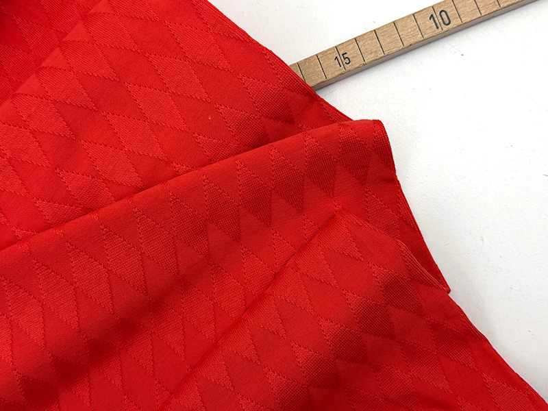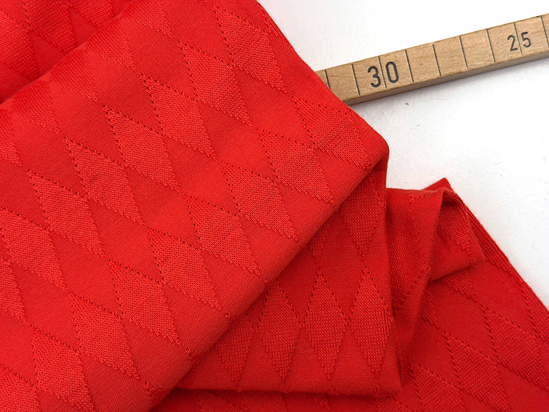 Baumwollstrickjersey mit eingestricktem Ton in Ton Rautenmuster. Das geometrische Rautenmuster ergibt sich durch glatt rechts und kraus gestrickte Rauten. Durch die unterschiedliche Strickoberfläche (glatt und kraus) ergibt sich eine schöne Abwechslung zwischen etwas glatteren und etwas matteren Flächen. Das Material ist fein gestrickt und in der Stärke geringfügig schwerer als ein normaler „Baumwolljersey“. Der Farbton ist ein leuchtendes, helles Rot. Perfekt für erste Frühlingsprojekte!