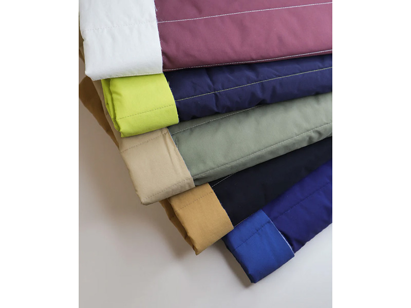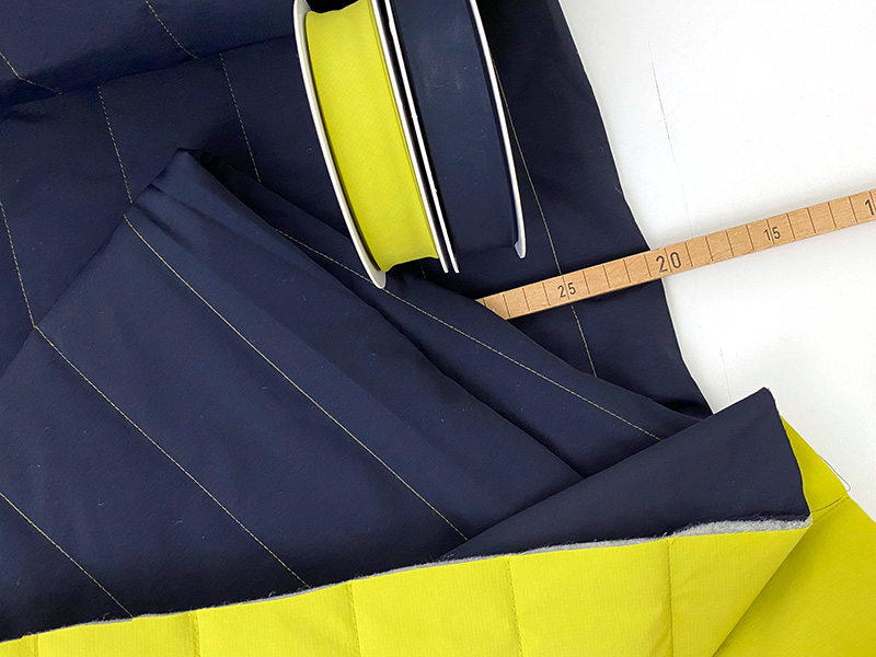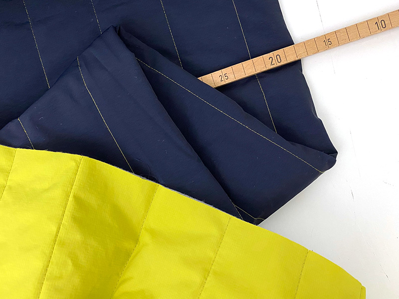 Perfekter Outdoorsteppstoff mit zwei gleichwertigen Seiten, durchgesteppten Nähten und einem matt samtigen Finish. Wasserabweisend, antistatisch, durabel, schön warm und außerdem richtig schick! Das Material ist als Doubleface konzipiert, d. h. beide Seiten sind gleichwertig einsetzbar. Die nachtblaue Seite ist mit Garn in Gelb durchgesteppt, so dass hier noch ein sehr schöner Kontrast sichtbar ist.