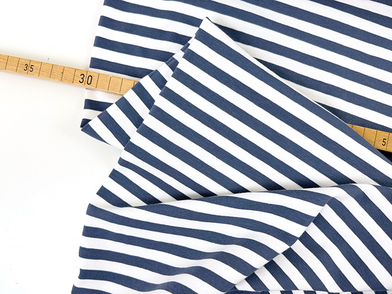 Baumwoll Jersey mit schicken Streifen in Jeansblau und Weiß. Klassisch und immer wieder gut. Die Streifen sind eingewebt, also auch von hinten sichtbar (nicht gedruckt).