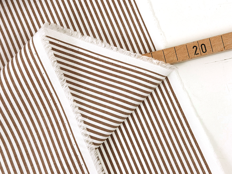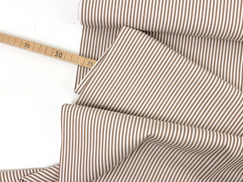 Yarn Dyed Cotton mit Längsstreifen in schönem Beigebraun und Weiß. Die Oberfläche ist glatt und angenehm, ein weicher und leichter Stoff, der trotzdem etwas Stand hat.