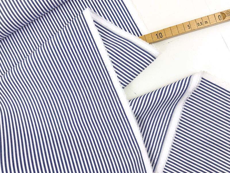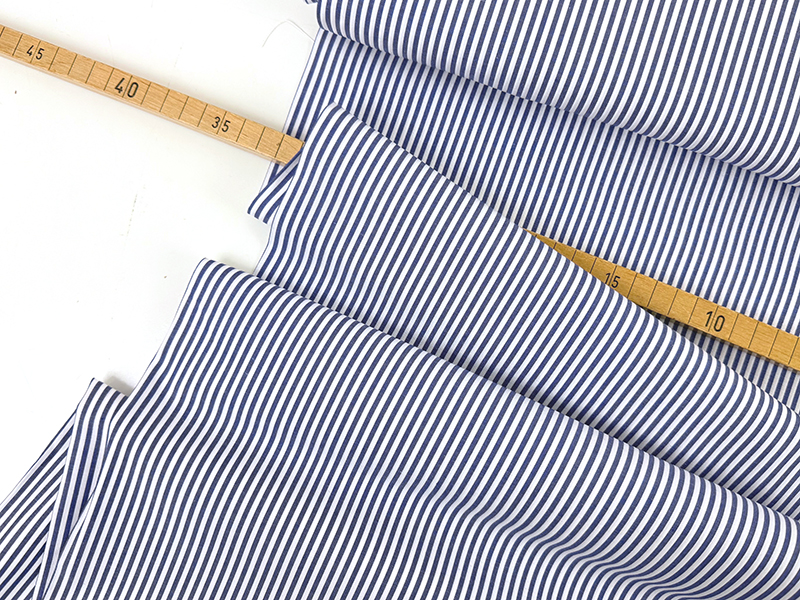 Yarn Dyed Cotton mit Längsstreifen in schönem Marineblau und Weiß. Die Oberfläche ist glatt und angenehm, ein weicher und leichter Stoff, der trotzdem etwas Stand hat.