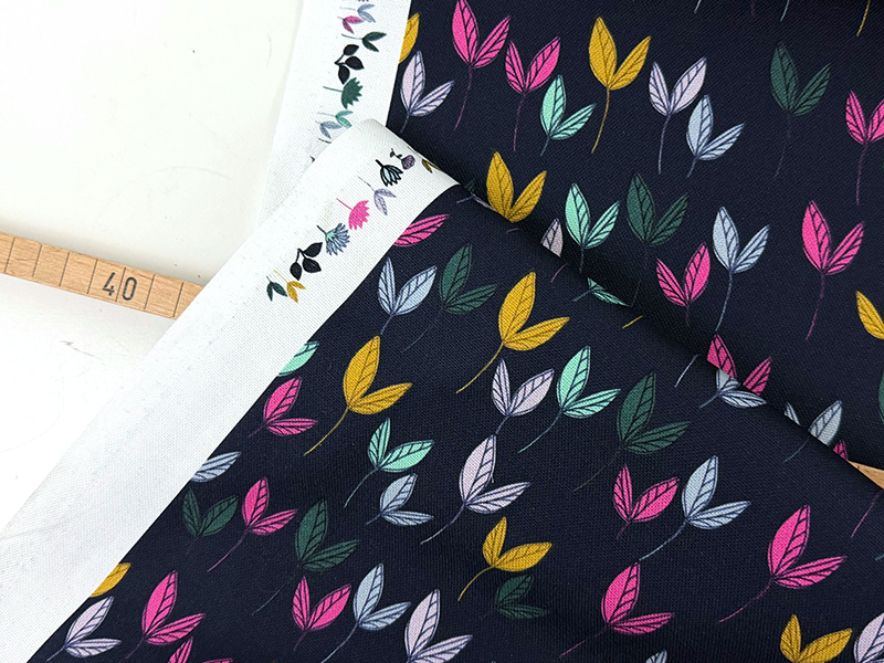Leichter bis mittelschwerer Baumwoll-Canvas mit Blättern in Grün, Pink, Gelb auf Navy.