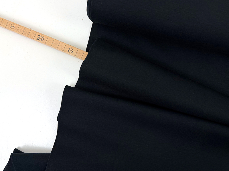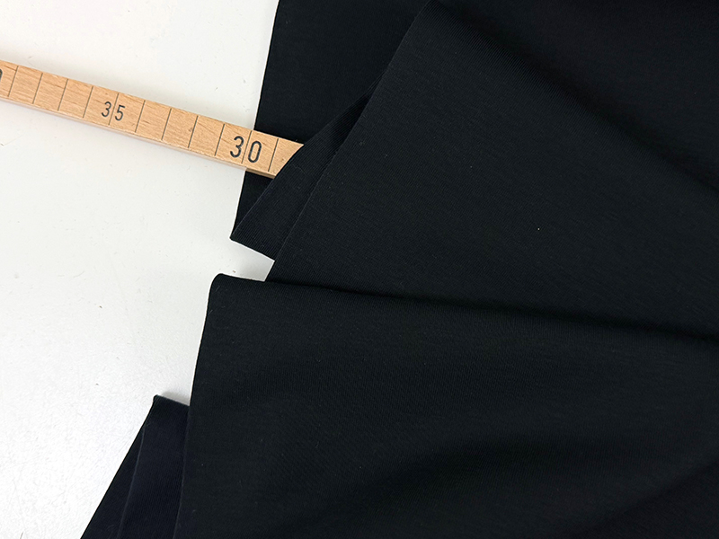 Hochwertiger Baumwolljersey, glattgestrickt mit seidigem Griff und eleganter Oberfläche. Der Jersey ist beidseitig glatt rechts gestrickt, jedoch kein Interlock, sondern eine zartere Ware. Dadurch ergibt sich ein sehr schöner Fall und ein sehr angenehmer Touch. Der Farbton ist ein klassisches Schwarz.