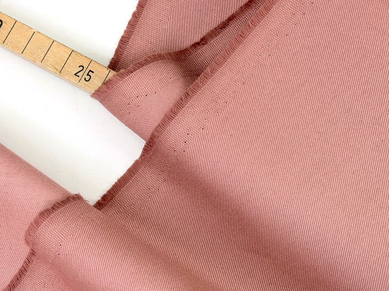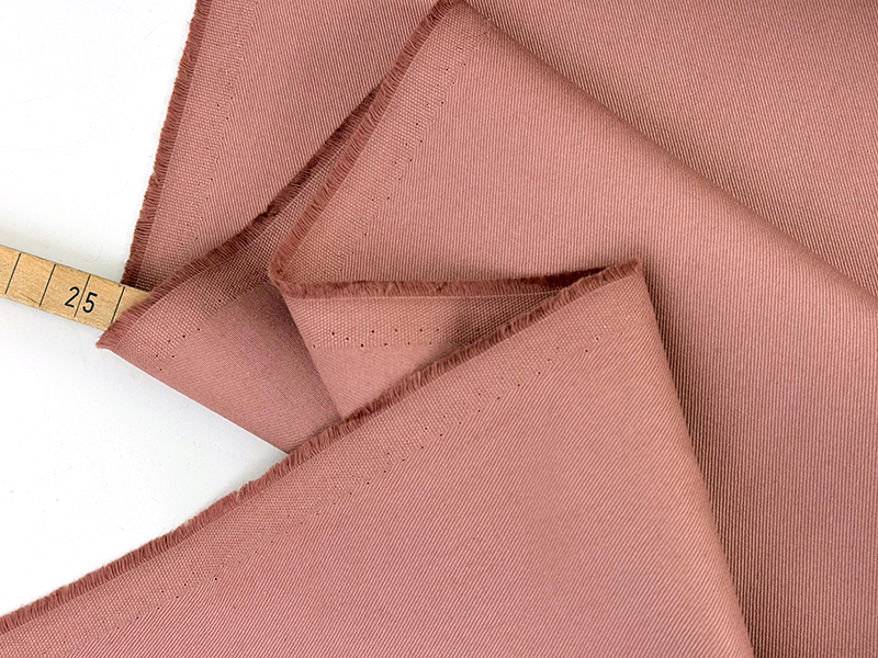 Baumwolltwill mit schöner Webstruktur und samtiger Oberfläche in einem sehr schönen Altrosa, gedeckt, aber intensiv. Der Stoff hat etwas Stand, aber auch einen schönen Drape. Vom Charakter ist es eine Mischung zwischen elegant und sportlich lässig.