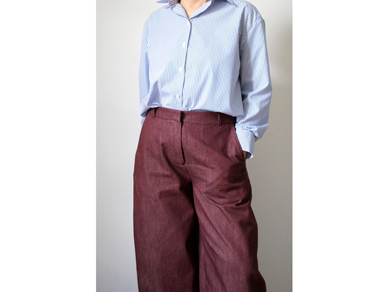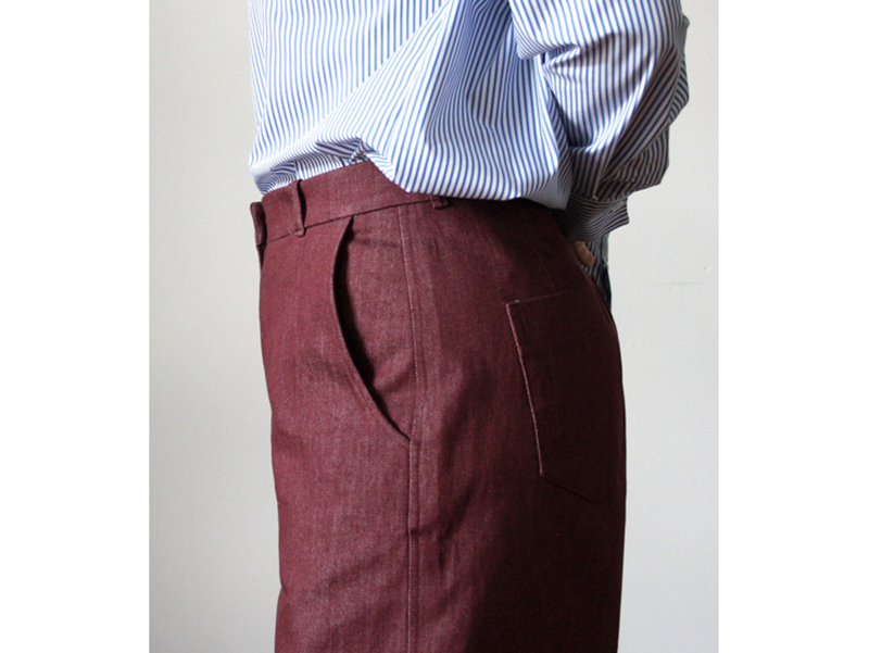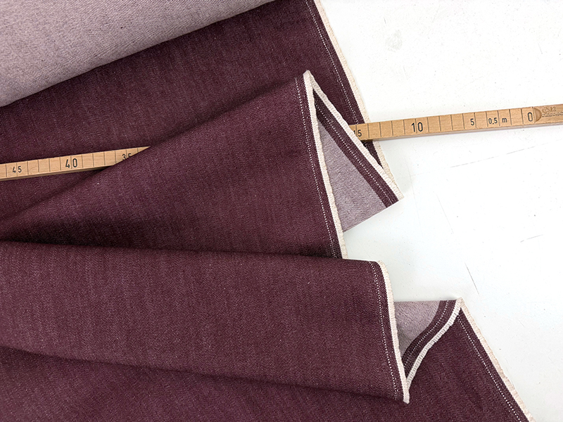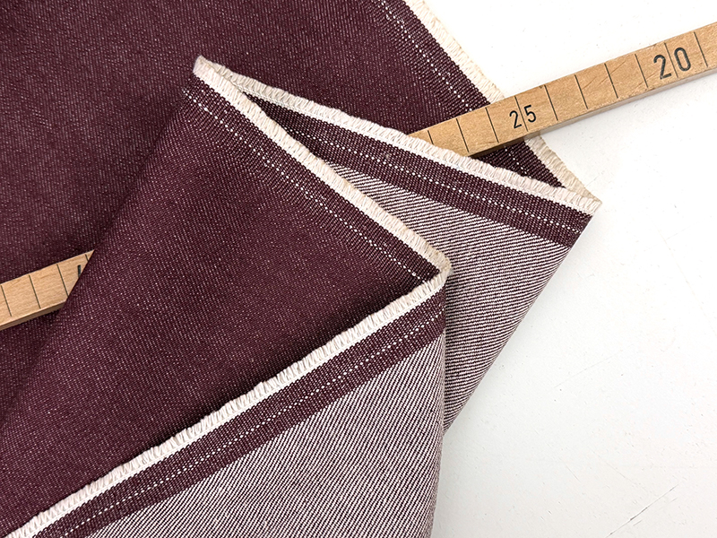 Klassischer Denim in dunklem Burgundy mit gleichmäßiger Färbung und sehr schöner Struktur. Das Material hat einen schönen Stand und eine klassische Stärke für Hosen oder Jacken. Nicht zu leicht und nicht zu dick, so dass er sich sehr angenehm verarbeiten lässt.