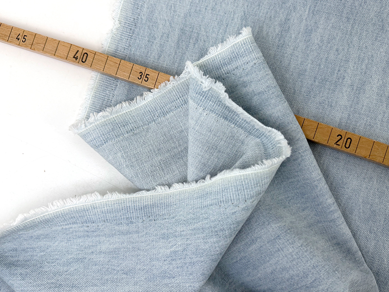 Klassischer Denim in hellem Denimblau mit lebendiger Oberfläche. Der Jeans ist gewaschen, besitzt jedoch trotzdem eine gleichmäßige Färbung und einen weichen Griff. Dieser Denim fällt sehr schön, er ist etwas lockerer gewebt als klassischer Jeanshosendenim. Dadurch besitzt er einen frühlingshaft frischen Charakter.