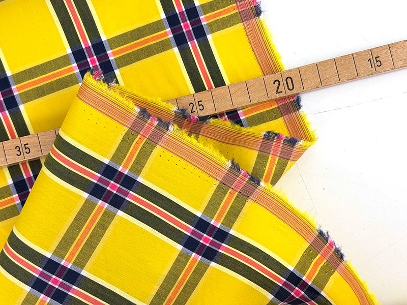 Extrem schöne Popeline mit feiner Webstruktur und glatter Oberfläche. Das Design ist markant in der Trandfarbe Gelb mit Karo in Navy und Pink.