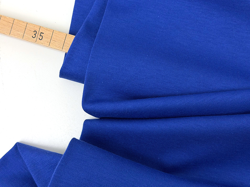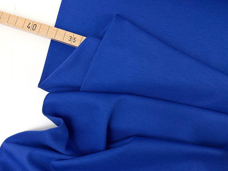 Hochwertiger und zarter Baumwolljersey, glattgestrickt in einem leuchtenden Azurblau. Es handelt sich um ein Designerleftover, also einem Überhang aus einer namhaften Modeproduktion. Das Material hat einen wunderschönen Griff, die Oberfläche hat ein samtiges Finish. Es ist ein sehr feines Interlockgewebe, d. h. der Jersey rollt sich nicht :-)