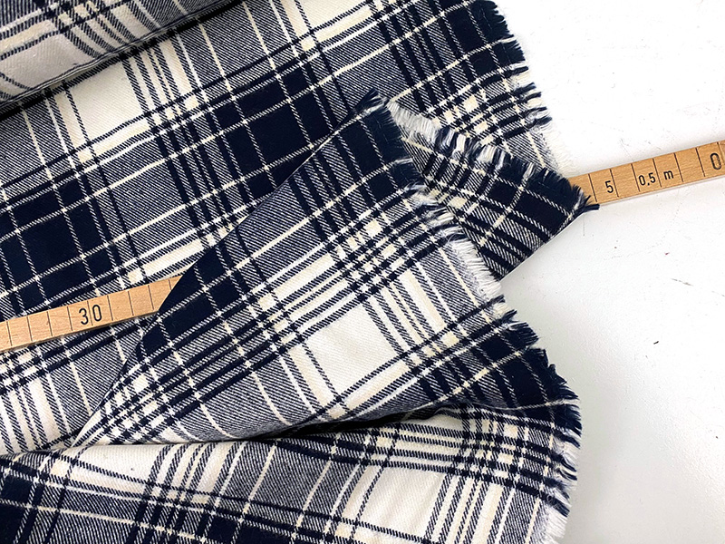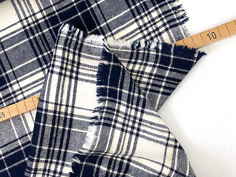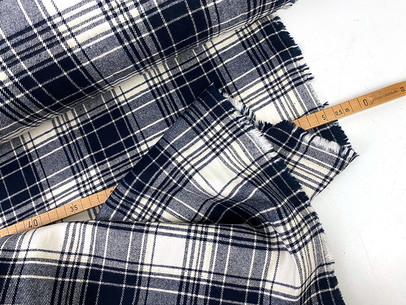 Der Stoff ist ein schön kuscheliger Baumwollflanell mit einem klassischen Karomuster in Wollweiß mit Navy und einem sehr dezenten Streifen in hellem Ecru. Diese dritte Farbe fällt kaum auf, trägt jedoch zur Harmonie des Designs bei.