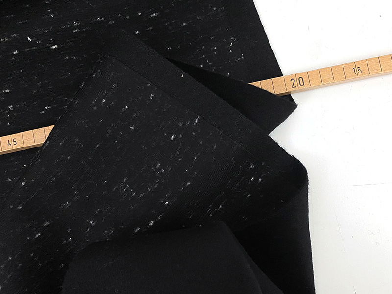 Hochwertiger und wunderbar weicher Mantelwollstoff, zweilagig in tiefem Schwarz auf der einen und dezent gesprenkelt auf der Innenseite. Die sehr edle rechte Seite ist eine etwas dickere und extrem weiche Wolle, die Innenseite eine Art Wollvlies die dem Oberstoff einen guten Halt gibt. Die Oberfläche ist durch den Cashmereanteil hochwertig weich, das Material besitzt Volumen und einen schönen Stand. Der Wollstoff muss nicht zwangsläufig gefüttert werden.