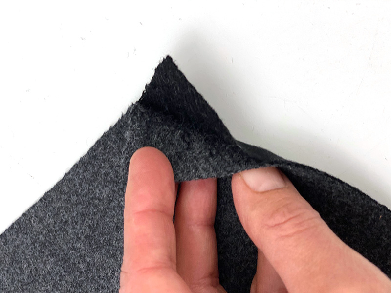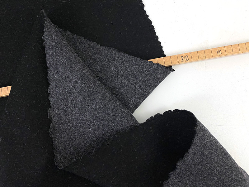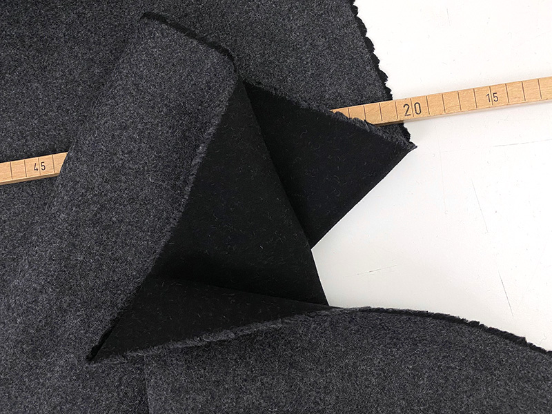Hochwertiger und wunderbar weicher Mantelwollstoff als Doubleface, also doppelseitig in Schwarz und Dunkelgrau. Beide Seiten sind gleichwertig einsetzbar. Die Oberfläche ist schön weich und glatt, das Material besitzt Volumen und man merkt am Griff die hohe Qualität dieses Wollstoffs. Der Stoff muss nicht zwangsläufig gefüttert werden – vor allem auch, weil dieser Mantelstoff ein splittable Doubleface ist. Das heißt, er besteht aus 2 Lagen Wollstoff, die sich (mit Geduld) manuell voneinander trennen lassen. Das ermöglicht ein gegenseitiges Ineinandervernähen an den Saumkanten, was einen sehr schönen und professionellen Abschluss ergibt.