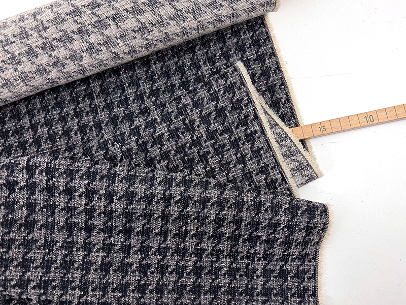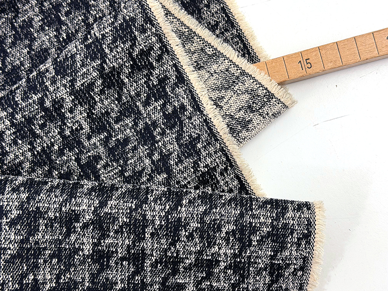 Designerleftover Strukturdenim mit eingewebtem Muster. Das Muster ist eine Hahnentrittstruktur, die jedoch nicht scharfkantig, sondern eher schemenhaft ausgeprägt ist. Ein sehr lässiges und ganz besonderes Design. Markant, aber alles andere als aufdringlich. Farblich eine Kombination aus tiefem Indigo und Wollweiß. Das Material hat einen schönen Stand aber auch weichen Griff.