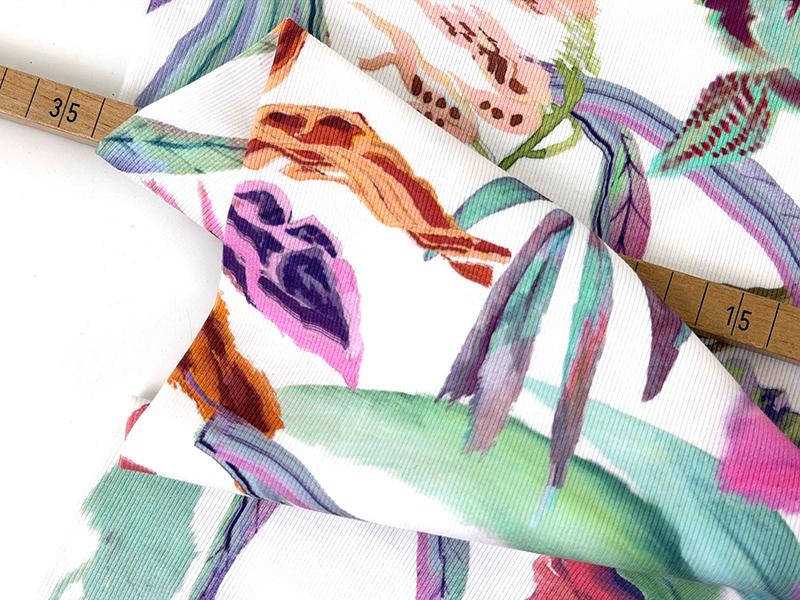 Es handelt sich um ein Designerleftover, also einem Überhang aus einer namhaften Modeproduktion. Das Material hat einen wunderschönen Griff, fühlt sich fast an wie Tencel und ist damit sehr angenehm auf der Haut. Der Druck ist so satt, dass sich keine weißen Streifen ergeben, wenn der Rippenjersey gedehnt wird.