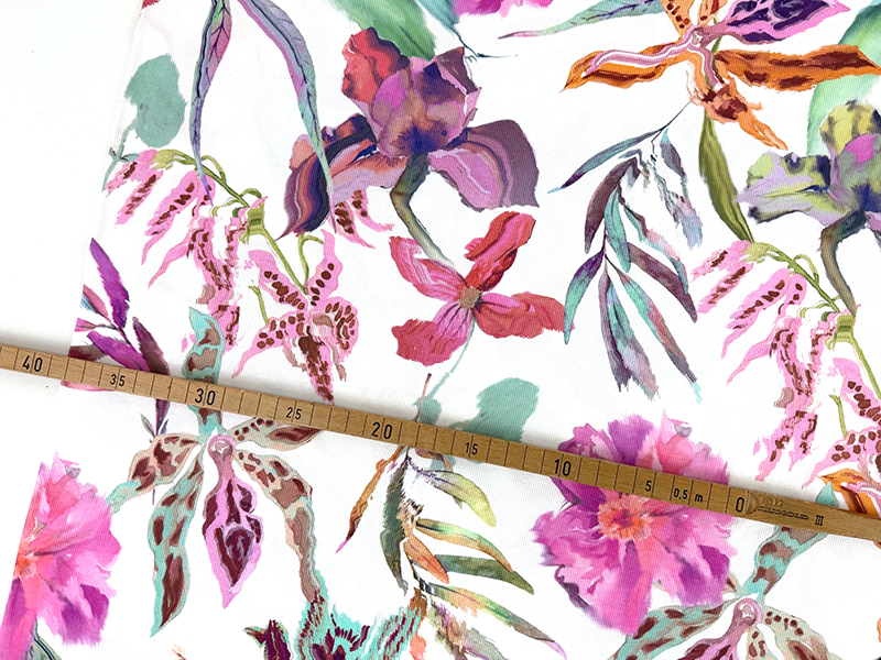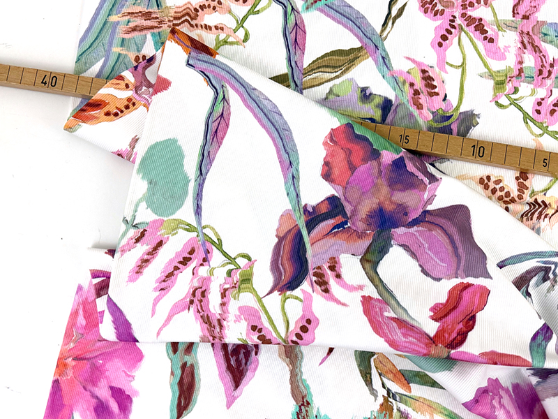 Hochwertiger und samtig weicher Baumwolljersey mit einer feinen Rippe und einem wunderschönen floralen Design. Die Blüten sind wie hingetuscht und wirken daher lebendig und vielfältig. Die Farbzusammenstellung ist eine Kombination aus Pastelltönen und kräftigen Akzenten.