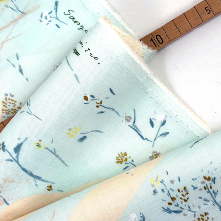 Dieser Stoff ist ein Double Gauze Stoff, d. h. er besteht aus 2 zarten Lagen Baumwollstoff, die punktuell miteinander verwebt sind. Dadurch entsteht ein besonders weicher Fall und schöner Griff.