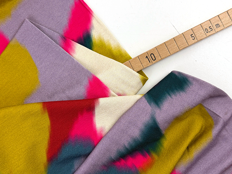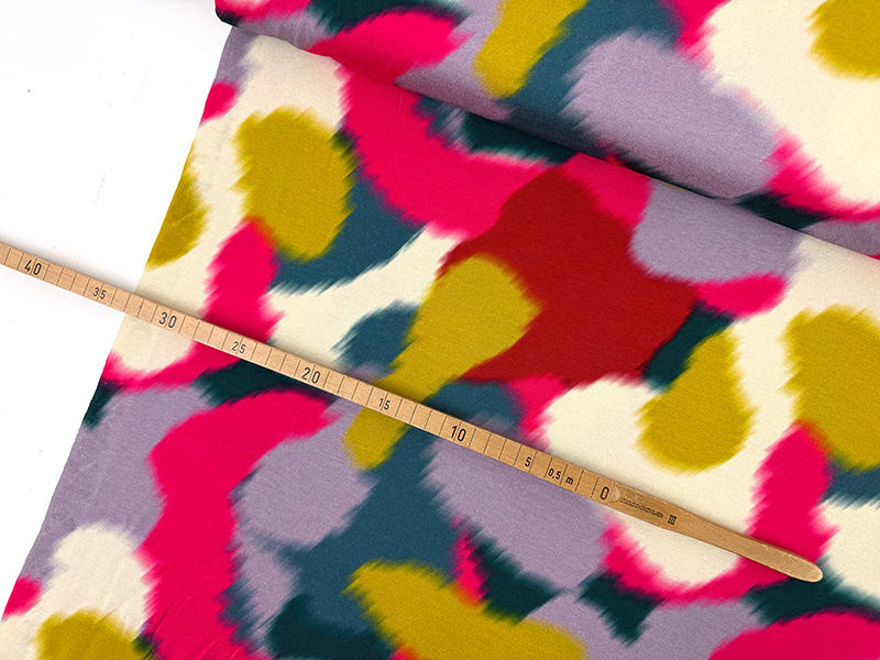 Leichter bis mittelschwerer Jersey aus Viskose mit Elastananteil. Der Stoff hat eine angenehme Schwere, fällt dadurch sehr schön und hat eine samtig matte Oberfläche. Das Printmuster zeigt eine sehr harmonische Farbkombination aus Pink, Blau, Grün, Rot und Safrangelb die eine lebendige, malerische Wirkung haben.