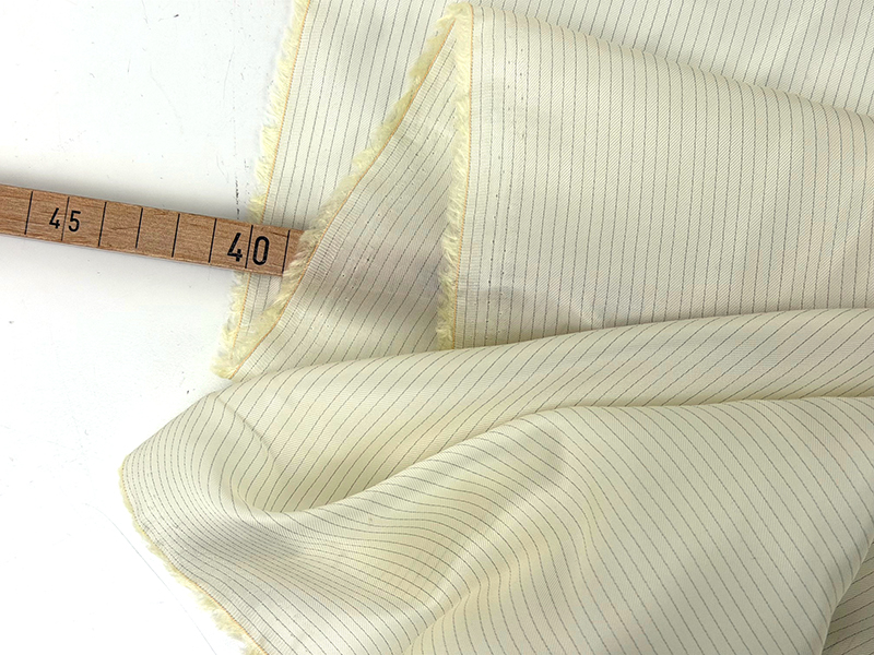 Klassischer, zarter Futterstoff in Ecru mit sehr feinen hellgrauen Streifen (einfadig) mit dezentem Glanz. Seidig glatt und schön leicht, damit er nicht aufträgt und gutes An- und Ausziehen ermöglicht.