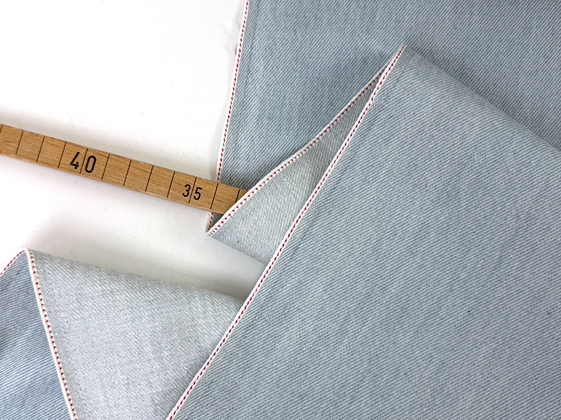 Tradioneller Selvedge Denim, made in Japan. Selvedge Denim erkennt man immer an der farbigen Webkante (in diesem Fall mit roter Kante) sowie der schmalen Breite. Selvedge Denims werden auf Schützen- bzw. Schiffchenwebstühlen gewebt (deren Breite auf ca. max. 85cm begrenzt ist). Diese Technik erlaubt eine stabilere Bindung, wodurch Selvedge Denims besonders robust und langlebig sind. Die Kanten sind gefasst und fransen nicht aus. Gerne wird der Saum umgekrempelt, um die markante Kante (Selvedge) zu zeigen, sie gilt als das Markenzeichen für Selvedge Denim.