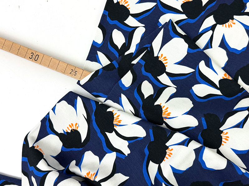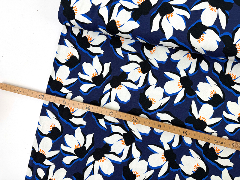 Einmal anfassen und nicht mehr loslassen. Der Stoff fällt fließend elegant und besitzt eine samtige, weiche Oberfläche. Stilisierte Seerosen mit weißen Blütenblättern auf blauem Grund mit orangenen Farbtupfern