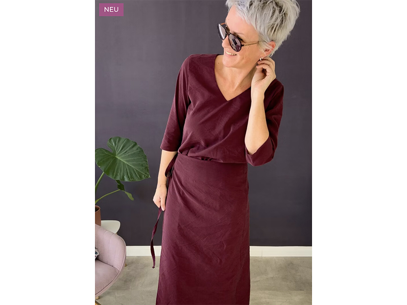 Das Oberteil mit schmeichelndem V-Ausschnitt sorgt für eine schöne Silhouette, während mit dem Rockteil das Besondere im Schnitt hervorgehoben wird. Die beiden Rockteile sind auf einer Seite des Kleides eingenäht und werden auf der anderen Seite lässig gebunden. So ergibt sich eine interessante Optik.