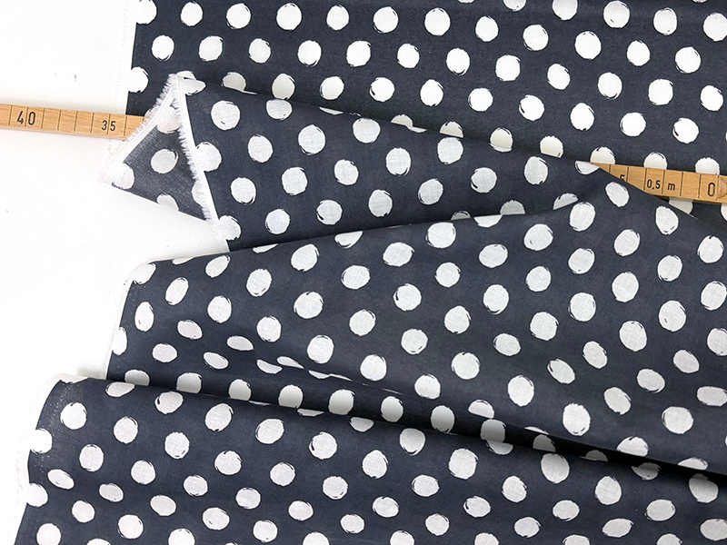 Dots sind der Trend des Sommers 2026! Seidig zarter Baumwollbatist mit lebendigem Punktdesign. Die Punkte sind nicht ganz rund und nicht ganz regelmäßig, das macht das Besondere dieses Musters aus. Die Farbe ist ein dunkles Blaugrau oder Graublau. Das Material ist sommerlich leicht mit einer hochwertig glatten und feinen Oberfläche.