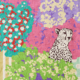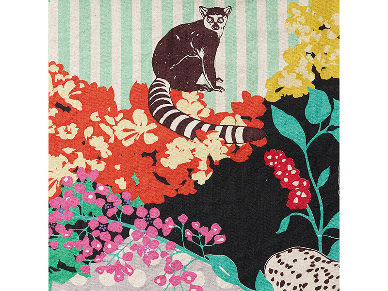 Grafisches Muster mit wilden Tieren (den typischen Echino Motiven wie, Leopard, Hirsch, Eule und Okapi) zwischen farbenfrohen Blüten, Blättern und Streifen. Durch den Siebdruck sind die Farben intensiv und kräftig, der Hintergrund ist naturfarben.