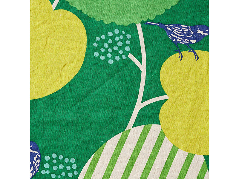 Grafisches Muster mit großen Kirschen, Blättern und Vögelchen. Durch den Siebdruck sind die Farben intensiv und kräftig, der Hintergrund ist naturfarben.