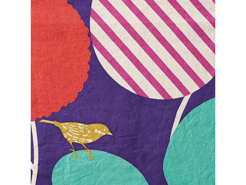 Grafisches Muster mit großen Kirschen, Blättern und Vögelchen. Durch den Siebdruck sind die Farben intensiv und kräftig, der Hintergrund ist naturfarben.
