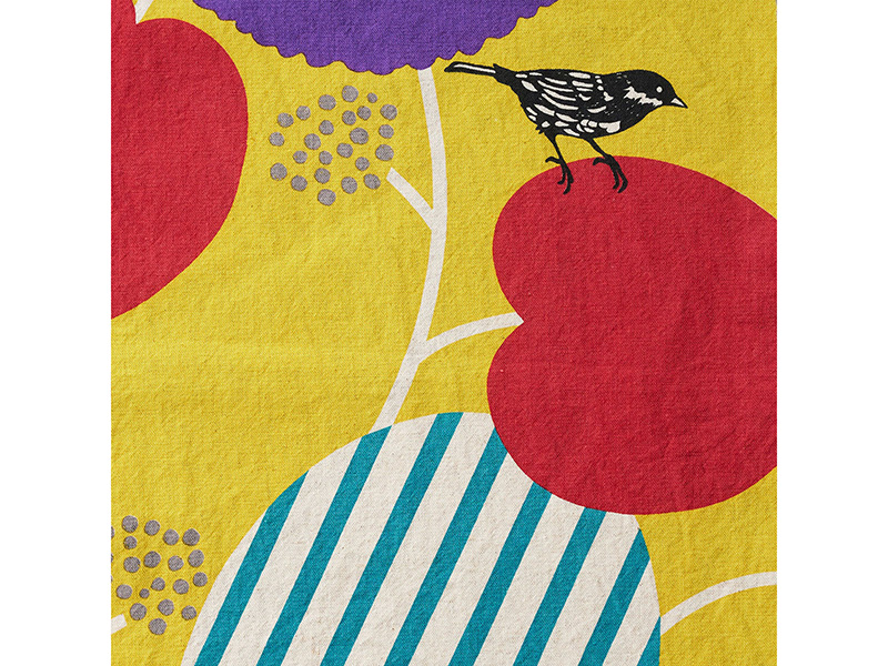Grafisches Muster mit großen Kirschen, Blättern und Vögelchen. Durch den Siebdruck sind die Farben intensiv und kräftig, der Hintergrund ist naturfarben.