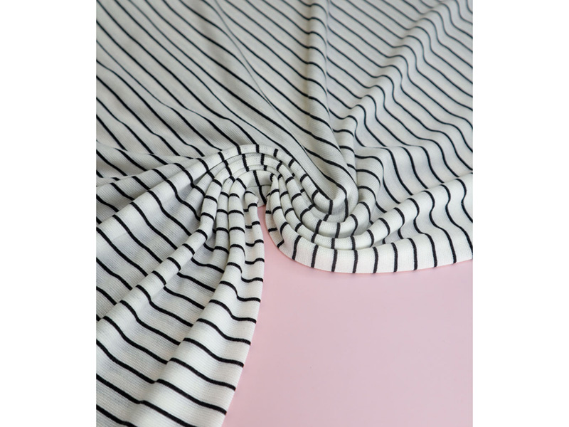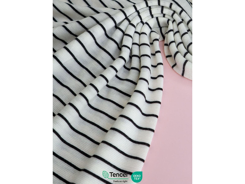 Sehr feine Mischung aus Tencel und Merino mit geringem Elastan-Anteil, zweifarbig in feinen Rippenstreifen gestrickt. Der Stoff ist wunderbar weich, fällt geschmeidig aber ist nicht zu leicht, der Griff ist weich und glatt. Für Basics oder auch ausgefallenere Schnittmuster.