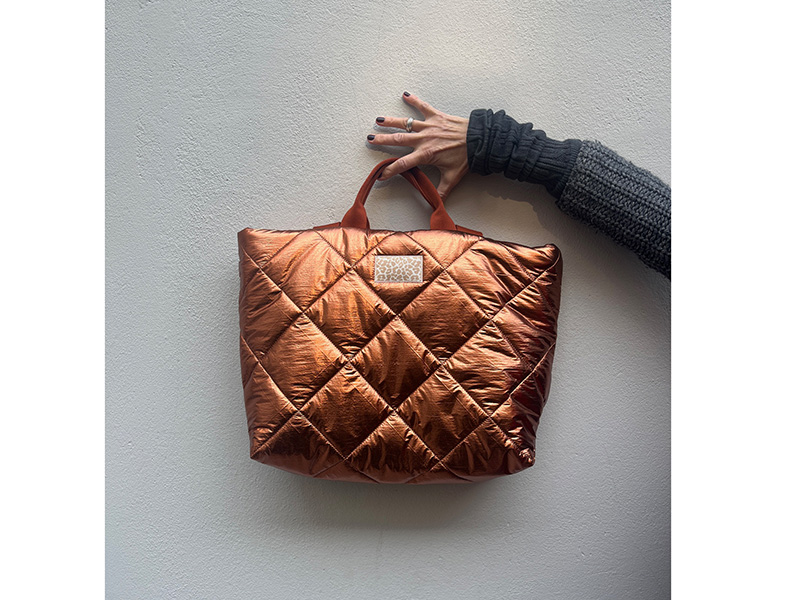 Die Tasche ist in einer cleveren Origami-Konstruktion gefertigt. Dadurch treffen die unteren Rauten des Steppstoffes exakt an den Seitennähten aufeinander, während der Boden komplett ohne sichtbare Nähte auskommt, das nennt man Designpräzision!