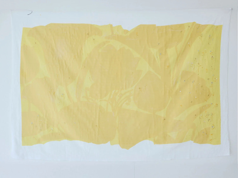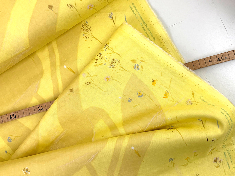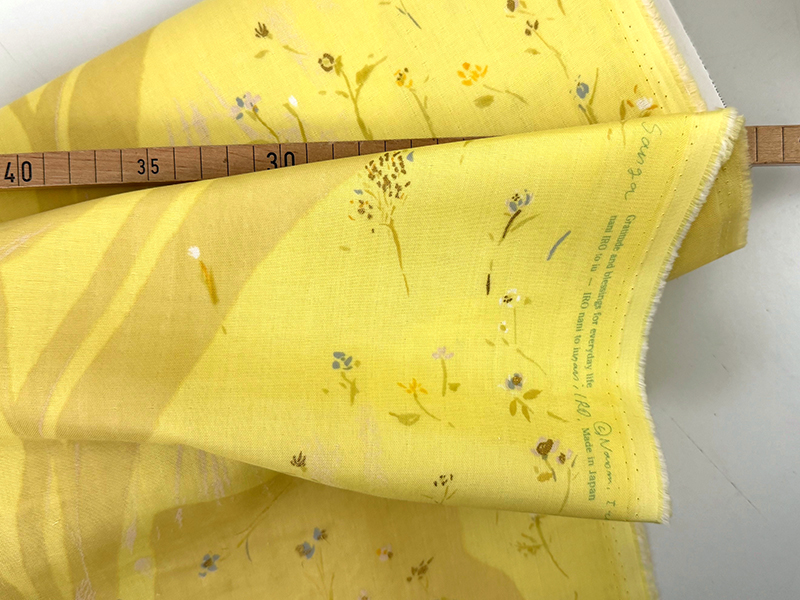 Das japanische Wort Sanga Bedeutet Zweig. Zarte hingetupfte Blüten und Zweige verteilen sich locker über die Stoffbreite, überlagert von einem großflächig floralen Design. Jeder Quadratzentimeter des Designs ist anders, jede Stelle wunderschön und lebendig. Die Farbstellung ist ein helles Zitronenfaltergelb in Kombination mit Dusty Yellow. Dazu winzige Akzente in Goldmetallic.