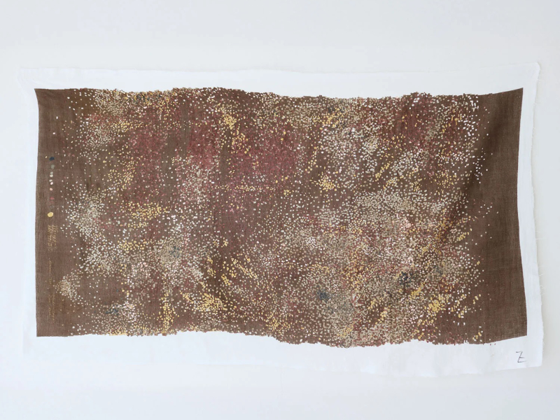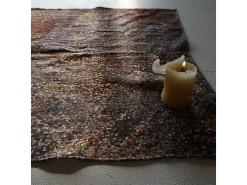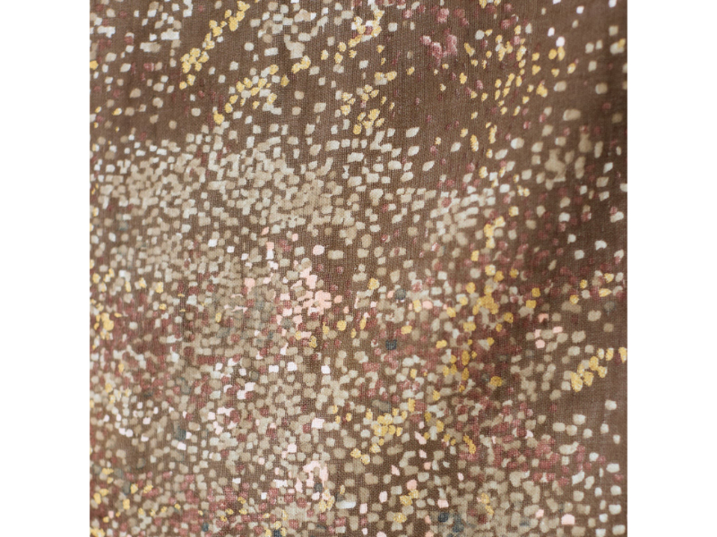 Hingetupfter Wassersprudel, unregelmäßig verteilt über die ganze Fläche. Jeder Quadratzentimeter des Designs ist anders, jede Stelle wunderschön und lebendig. Die Farbkombination aus unterschiedlichen Brauntönen ist wunderschön. Dazu winzige Akzente in Goldmetallic.