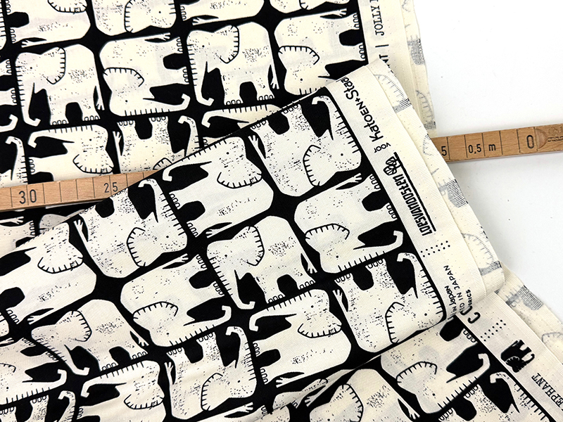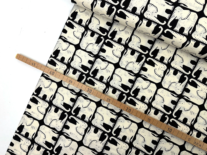 Grafisches Design mit Elefanten in Schwarz auf offweißem Grund. Die Elefanten sind in alle Richtungen ausgerichtet, so dass der Stoff in jede Richtung (längs, quer und Überkopf) verarbeitet werden kann.