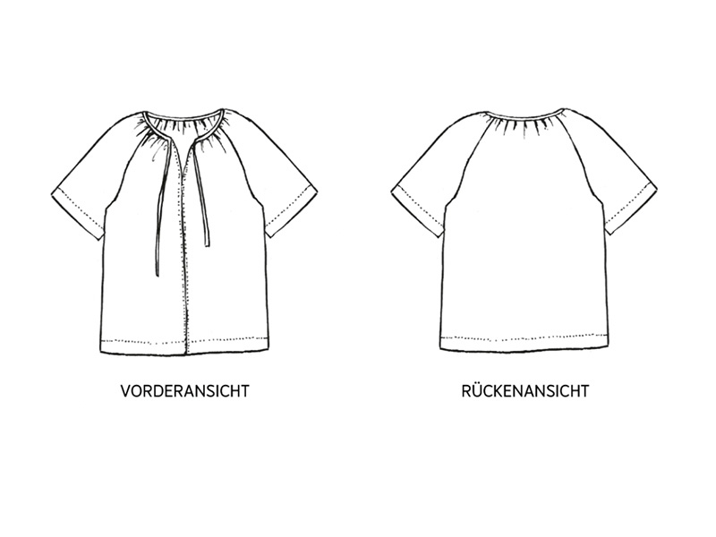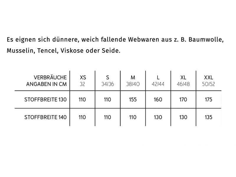 - Materialempfehlung: Es eignet sich dünne, leicht fallende Webware wie Baumwolle, Viskose, Tencel, Musselin, etc.