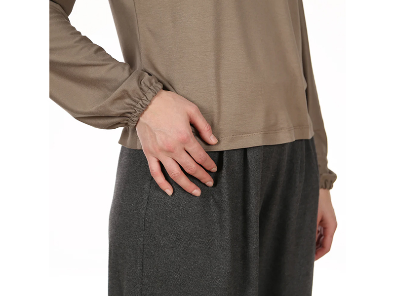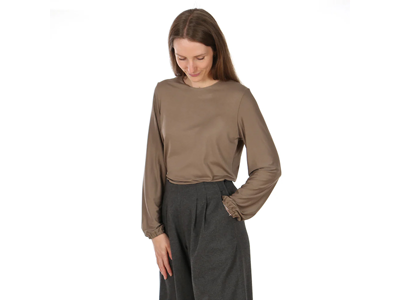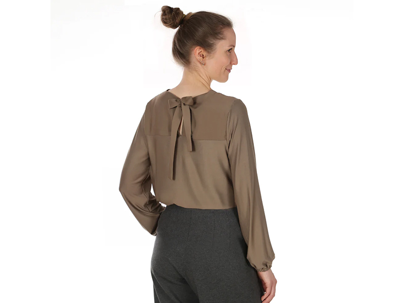 Frau Yelda ist dein neues Lieblingsshirt, wenn du Eleganz mit iener Prise Raffinesse liebst. Auf den ersten Blick wirkt es schlicht, doch sobald du dich drehst, kommt der Wow-Effekt: Die Rückenteilpasse aus edler Webwre läuft in eine großzügige Schleife aus und öffnet sich zu einem dezenten Schlitz – ein Detail, das sofort Blicke auf sich zieht. genau die Art von Überraschung, die ein Basic in ein Statement-Piece verwandelt. Das Vorderteil ist clean gehalten und mit Beleg verarbeitet – so bleibt FRAU YELDA wunderbar vielseitig kombinierbar. Du entscheidest selbst, wie viel Ausdruck du deinem Shirt verleihst: Nähe die Ärmel schmal und klassisch, wenn du es elegant und zurückhaltend magst, oder entscheide dich für die weite Variante mit Kräuselung, wenn du einen Hauch Verspieltheit und Volumen möchtest. FRAU YELDA passt in deinen Alltag genauso wie zu besonderen Momenten.