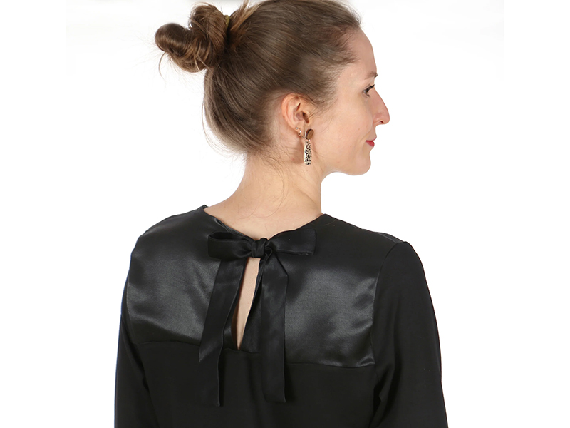 - Materialempfehlung: Es eignen sich feine elastische Stoffe wie Jersey aus zb. Viskose, Bambus oder Merino. Für die Passe und die Schleife eignet sich leichte Webware, zb. Viskose, Baumwollsatin, etc.