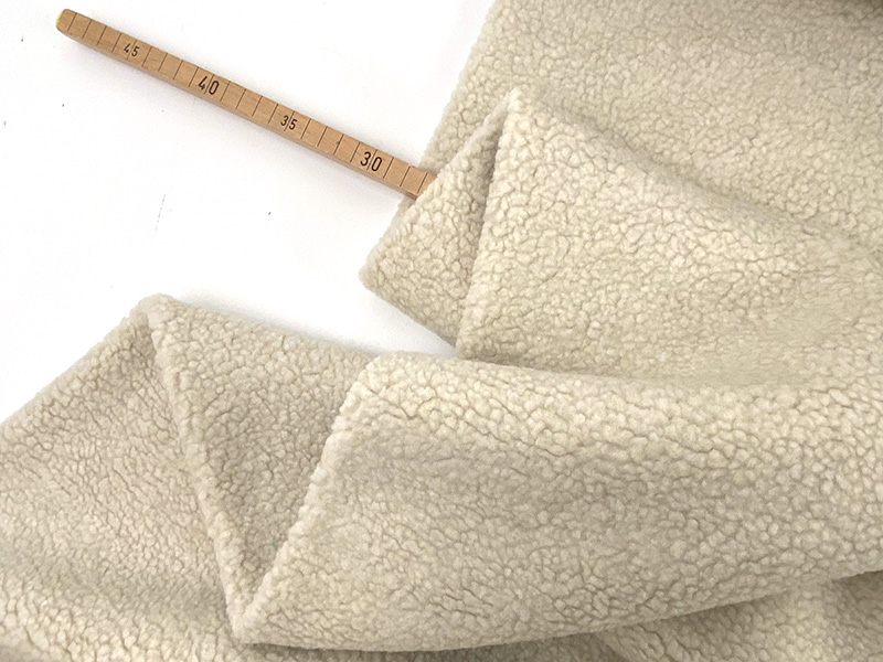 Flauschiger, voluminöser Teddy. Ein perfekter Wohlfühlstoff für die kalte Jahreszeit! Das Material hat einen superangenehmen Griff, weich und wollig, innen glatt mit sichtbarer Strickstruktur. Der Farbton ist ein Naturweiß, Offweiß, Wollweiß.